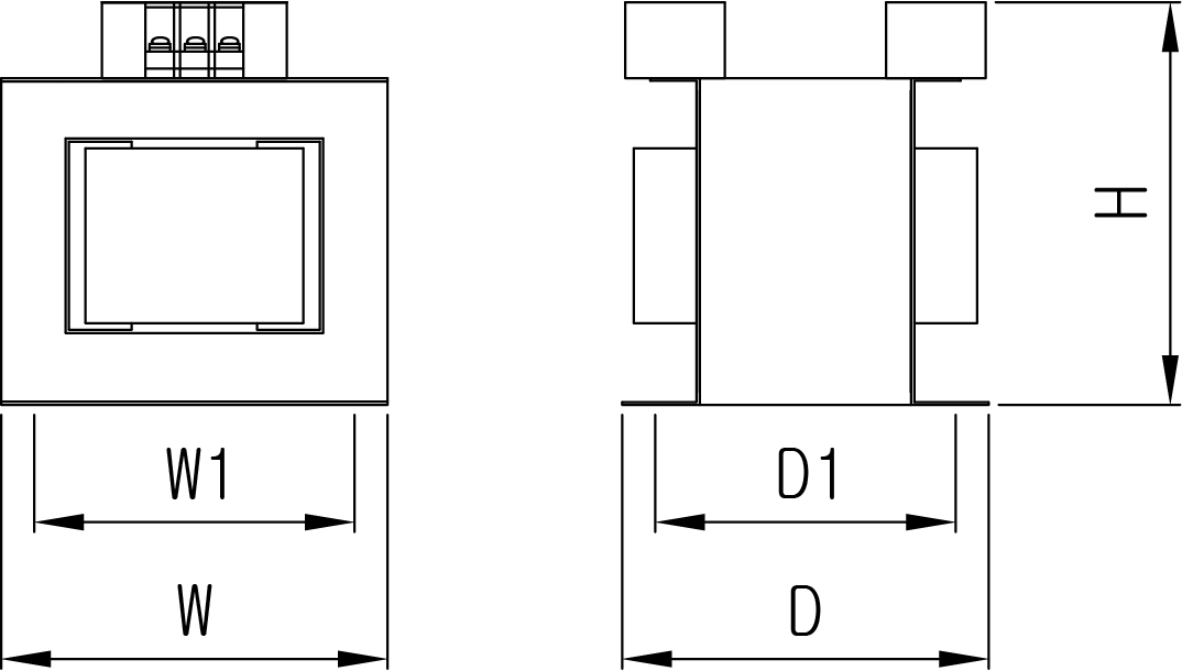 용량(kVA) | 가로 (W) | 가로홀 (W1) | 세로 (D) | 세로홀 (D1) | 높이 (H) | 단자 타입 | 취부홀 |